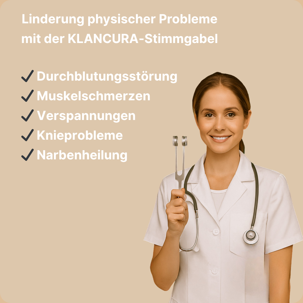 Sag Schmerzen den Kampf an! Die KLANCURA-Stimmgabel löst hartnäckige Verspannungen, fördert die Durchblutung und unterstützt deine schnelle Regeneration – natürlich, effektiv und vollkommen risikofrei.