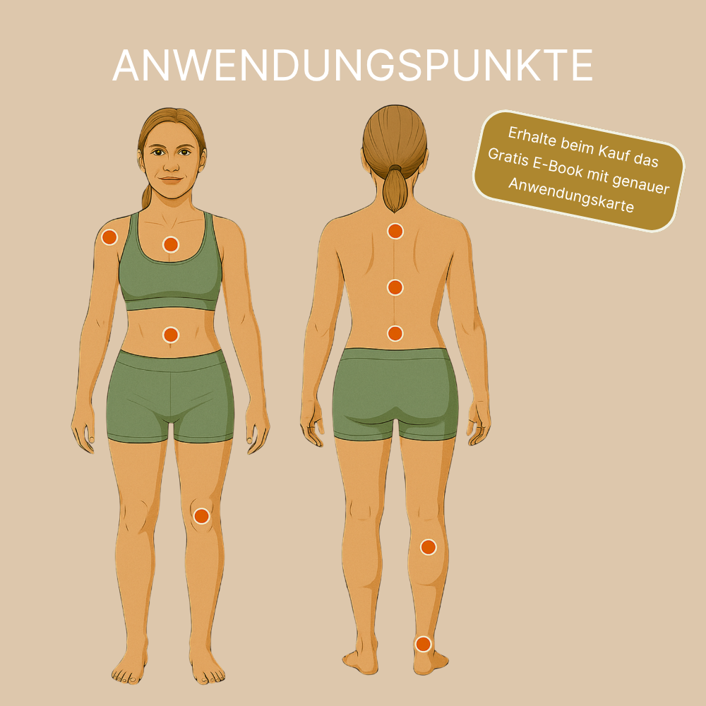 Unsere Stimmgabel kann an den markierten Körperstellen effektiv eingesetzt werden, um Schmerzen zu lindern und die Durchblutung zu fördern. Beim Kauf erhältst du ein Gratis E-Book mit detaillierter Anwendungskarte und einer Schritt-für-Schritt-Anleitung für die optimale Nutzung.